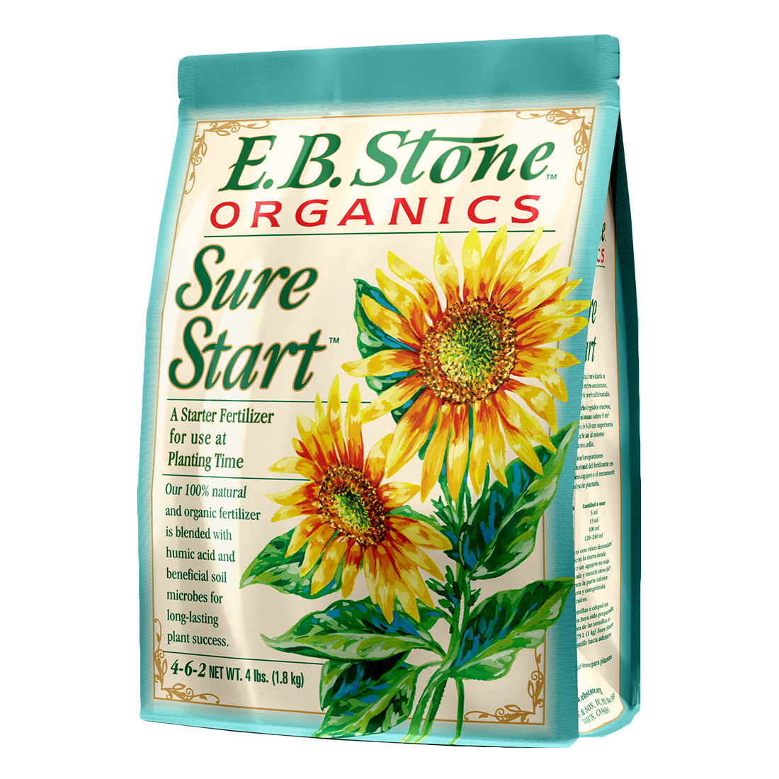 E.B. Stone Organics Sure Start is a blend of natural organic ingredients formulated to help newly transplanted plants develop strong roots and sturdy growth. Sure Start is rich in natural sources of phosphorus to help your plants develop a strong foundation for future growth. Our gentle and non-burning formula is safe to use with even the most tender transplants. It is blended with humic acid and beneficial soil microbes including mycorrhizae. NPK: 4-6-2 Derived from: Blood Meal, Feather Meal, Bone Meal, Dried Chicken Manure, Bat Guano, Alfalfa Meal, Kelp Meal, Potassium Sulfate, Humic Acids and Soil Microbes including Mycorrhizal Fungi.