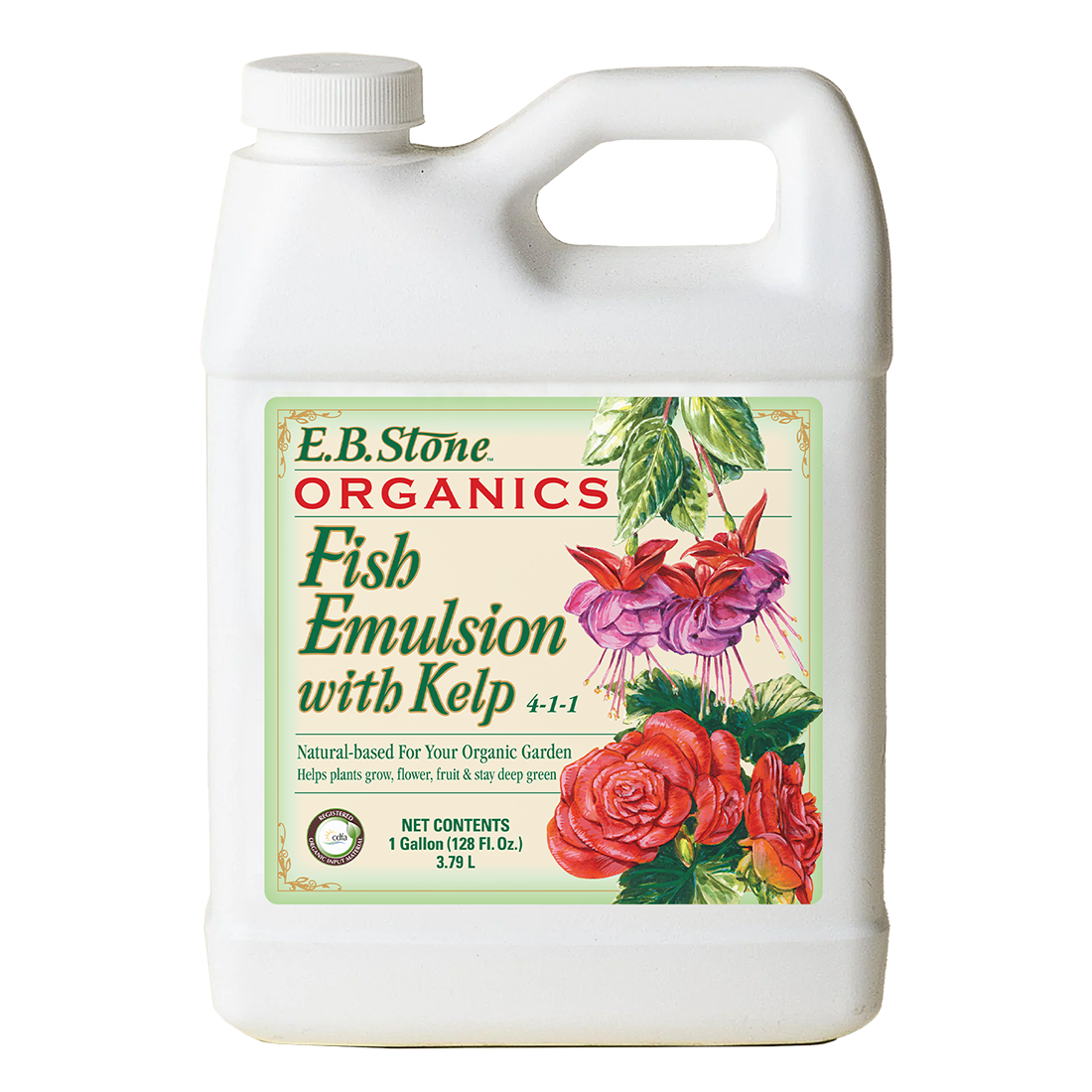 E.B. Stone Organics Fish Emulsion with Kelp is an all natural plant food to help plants grow, flower, fruit and stay deep green. NPK: 4-1-1 Derived from: Whole Fish, Fish Scraps, and Kelp. This liquid fertilizer is concentrated and must be diluted before use.